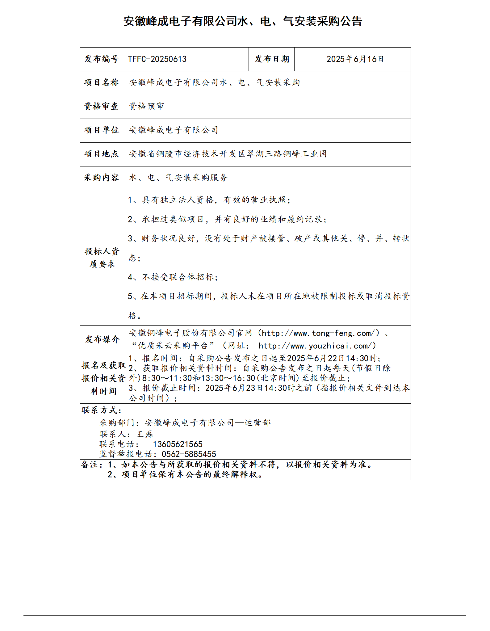 安徽峰成電子有限公司水、電、氣安裝采購(gòu)公告_01