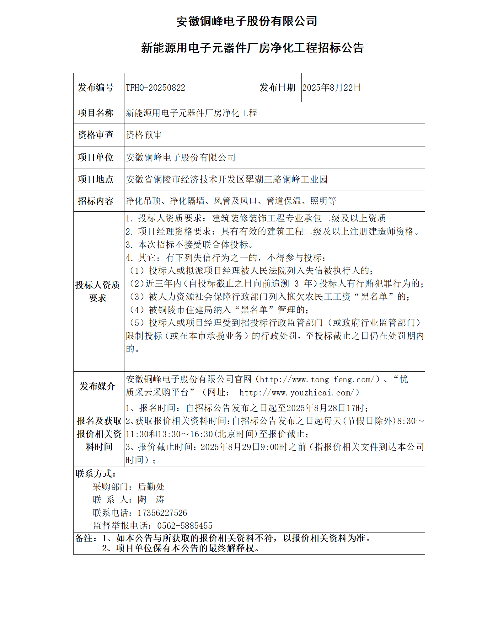 安徽銅峰電子股份有限公司 (新能源用電子元器件廠房?jī)艋こ?招標(biāo)公告)_01
