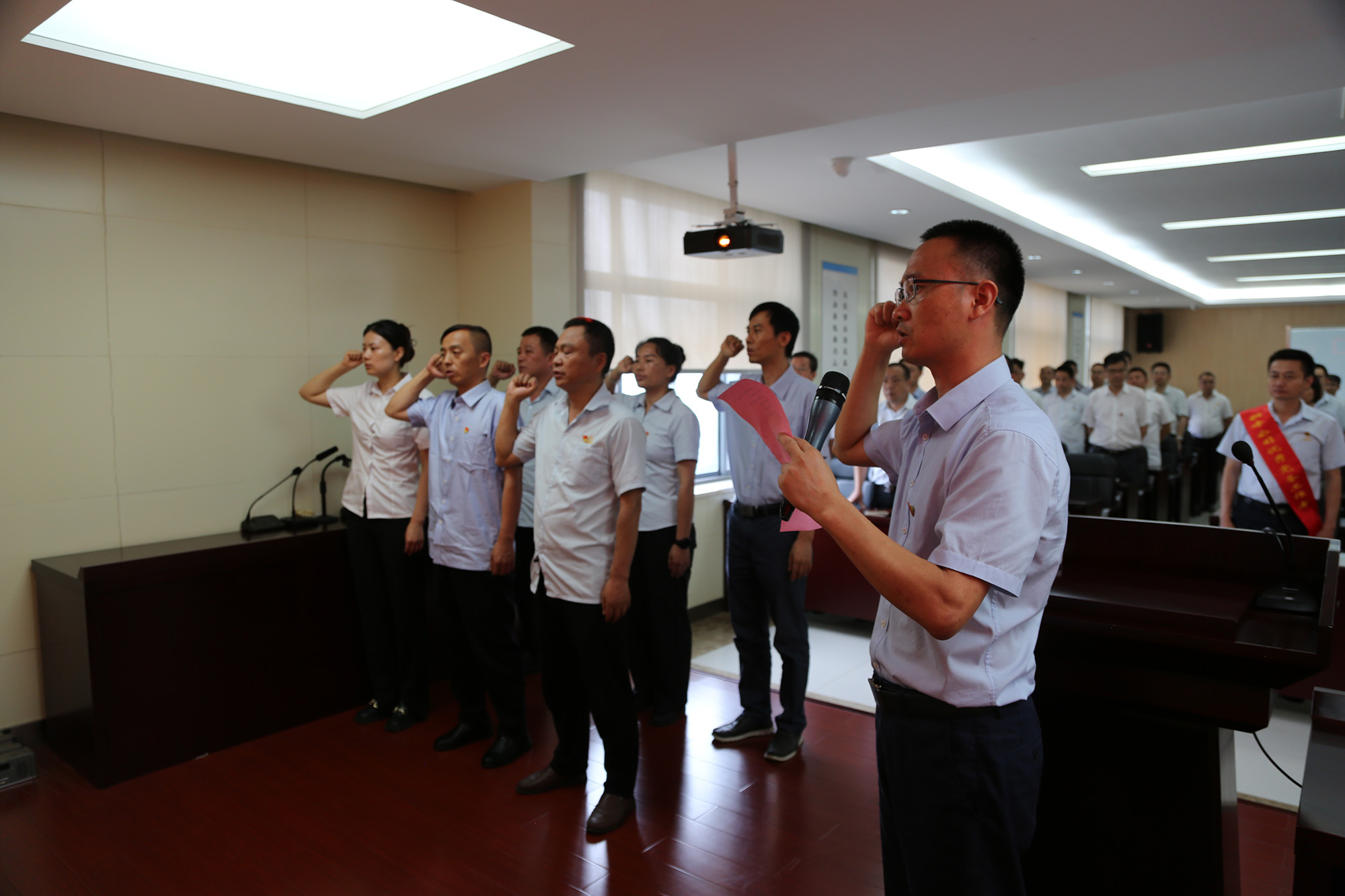 在首先進(jìn)行的新黨員入黨宣誓儀式上,黨委委員林政宣布新黨員名單,歡迎新黨員加入黨組織并向他們提出希望和要求。隨后,由黨委委員何曉明領(lǐng)誓,新黨員進(jìn)行入黨宣誓。在“兩優(yōu)一先”表彰環(huán)節(jié),公司黨委領(lǐng)導(dǎo)為受表彰對(duì)象頒發(fā)榮譽(yù)證書,“兩優(yōu)一先”代表分別作先進(jìn)事跡報(bào)告。