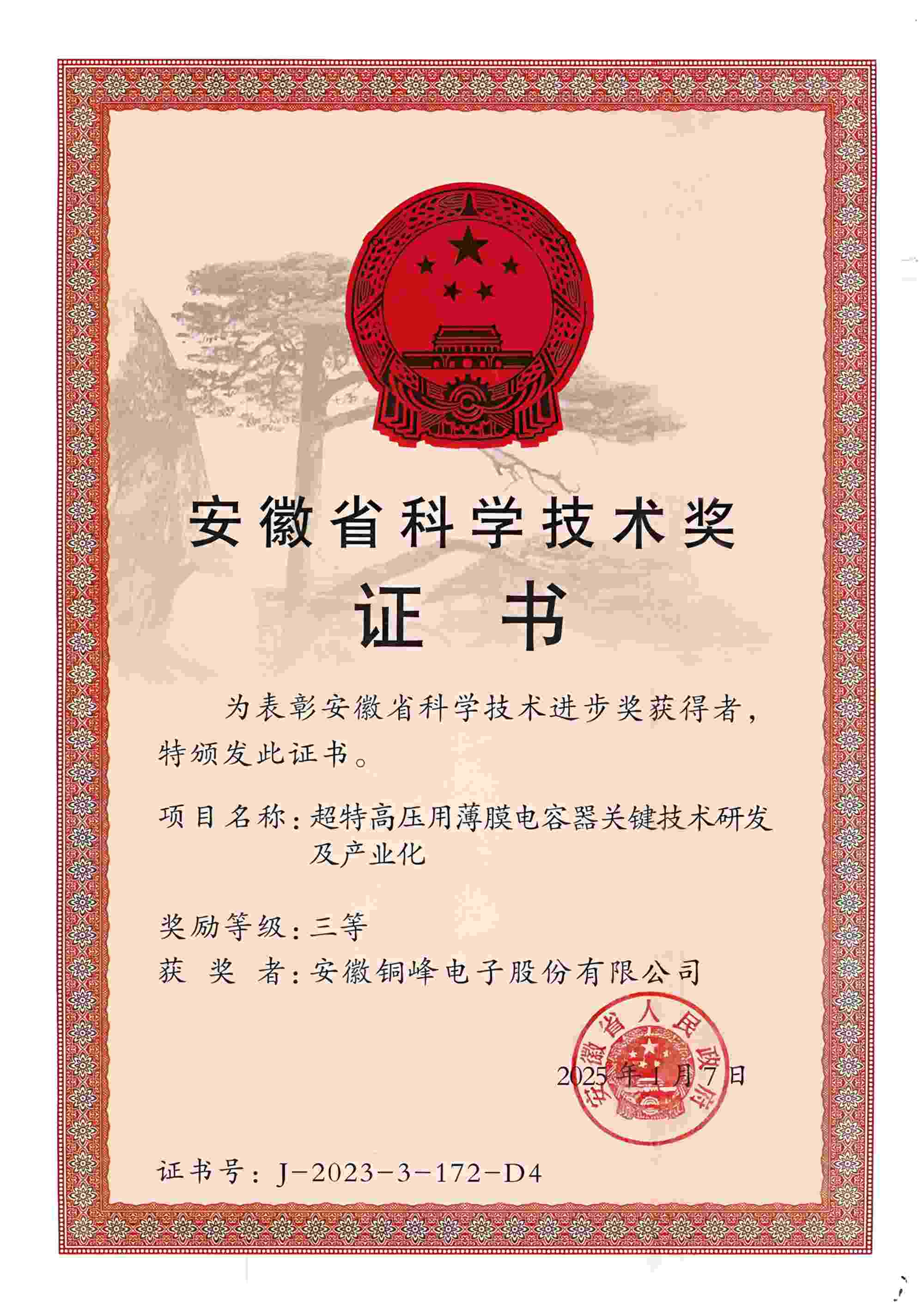 5月12日上午,安徽省科技創(chuàng)新大會召開,隆重表彰2023年度安徽省科學技術(shù)獎勵獲獎人員和組織。公司與國網(wǎng)安徽省電力有限公司、國網(wǎng)智能電網(wǎng)研究院有限公司、西安交通大學等單位聯(lián)合完成的“超特高壓用薄膜電容器關(guān)鍵技術(shù)研發(fā)及產(chǎn)業(yè)化項目”榮獲安徽省科技進步三等獎。